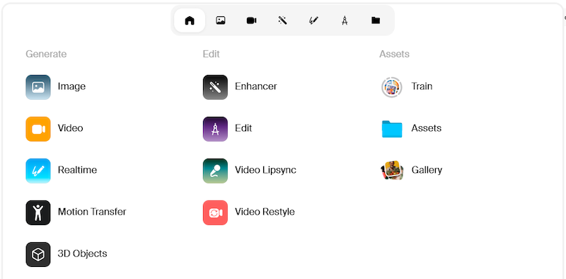 Trotz der großen Zahl an Modellen und Funktionen lässt sich Krea.AI sehr einfach benutzen, denn es ähnelt den bekannten KI-Chatbots: Das Tool kommt mit einer Menüleiste, einem Eingabefeld für Prompts und einer Suche aus. Der Home-Button in der Menüleiste öffnet eine Übersicht der Funktionen, die in die Rubriken „Generate“, „Edit“ und „Assets“ sortiert sind.