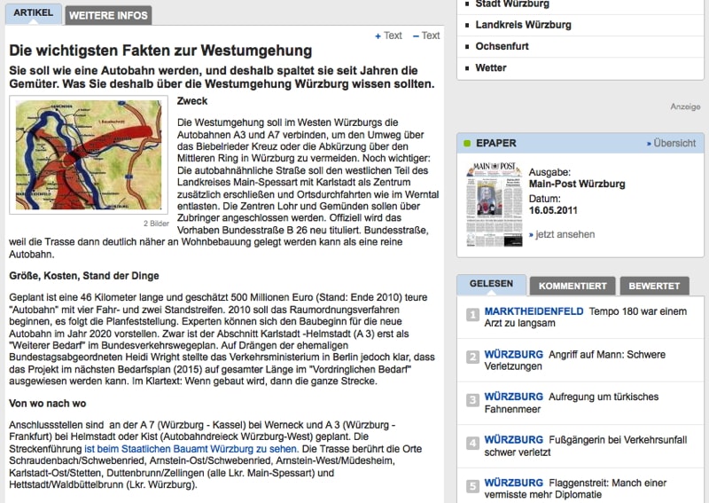 „Teilweise war der Sachverhalt sehr spekulativ, niemand wusste etwas Genaues“, sagt Rainer Stumpf, der stellvertretende Lokalchef der Main-Post in Würzburg. „Also versuchten wir, Licht ins Dunkel zu bringen. Aufklärung ist unser Hauptziel in der ganzen Angelegenheit.“ So wurde zum Beispiel ein redaktionelles Gespräch organisiert, in dem ein Experte vom BUND mit einem Straßenplaner aus dem Ministerium Argumente austauschte. Das Gespräch wurde in der Zeitung wiedergegeben. Kalkulationen, Preise und Zahlen rund um den geplanten Bau der Umgehungsstraße wurden überprüft. „Wir übersetzten die Fakten auch in Grafiken, zum Beispiel konnten wir so zeigen, wo Befürworter und Gegner wohnten und welche Städte oder Ortschaften wie betroffen wären“, sagt Stumpf. Die Polarisierung zwischen Gegnern und Befürwortern ist wie meist in solchen Fällen ein Problem. „Eine Bürgerinitiative ist dagegen, die Industrie- und Handelskammer dafür, die Würzburger Leser eher auch, weil sie sich eine Verkehrsentlastung erhoffen. Jede unserer Lokalausgaben bezieht eine eigene Position zu dem Problem“, erläutert Stumpf. Das spiegelt sich dann auch in den jeweiligen Kommentaren wider, die sehr unterschiedlich ausfallen können.
