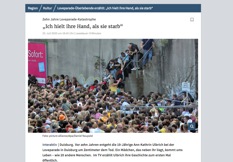 Im Juli 2020 jährte sich die Katastrophe auf der Duisburger Loveparade zum 10. Mal. Der Trierische Volksfreund hat in einer multimedialen Umsetzung auf das Ereignis zurückgeblickt, im Mittelpunkt steht eine Frau, die viel Glück hatte.
