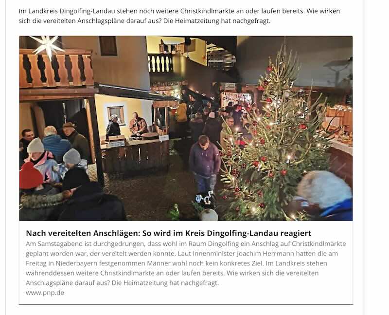 Mehrere Männer aus Ägypten, Syrien und Marokko sollen einen Anschlag auf einen Weihnachtsmarkt in oder bei Dingolfing in Niederbayern geplant haben. Aufgerufen wurde dazu offenbar in einer Moschee. Die Passauer Neue Presse informiert darüber in einem Newsblog.